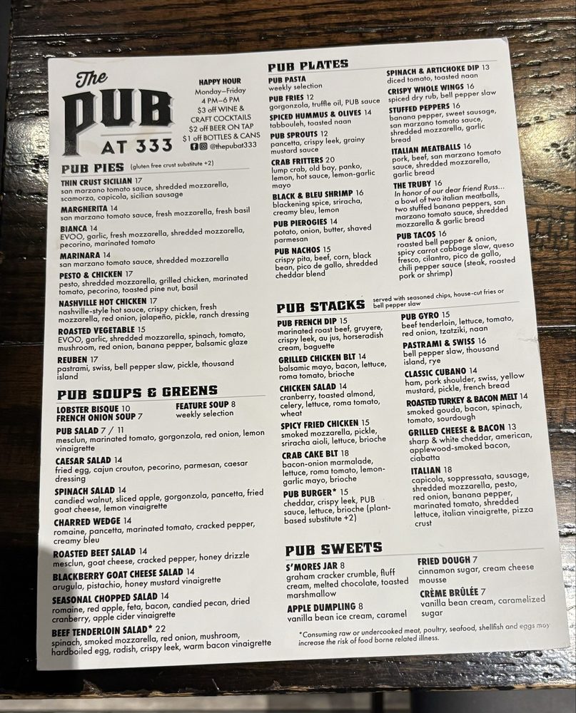 What sets The Pub apart is its inviting atmosphere—perfect for families and groups alike. With outdoor seating and a vibrant bar offering $3 off cocktails during happy hour, it’s an ideal spot for evening gatherings. The attentive service adds to the experience, ensuring that patrons always feel welcomed. Whether you're there for dinner or a lively night out with friends, The Pub At 333 delivers an exceptional culinary adventure in a relaxed environment.